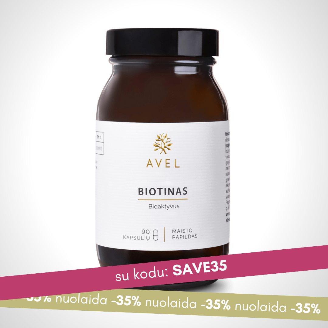 Biotinas yra gyvybiškai svarbus sveikai odai, stipriems plaukams ir nagams. Jis padeda palaikyti normalią odos būklę, skatina plaukų augimą ir stiprina nagus, mažindamas jų trapumą ir lūžinėjimą.