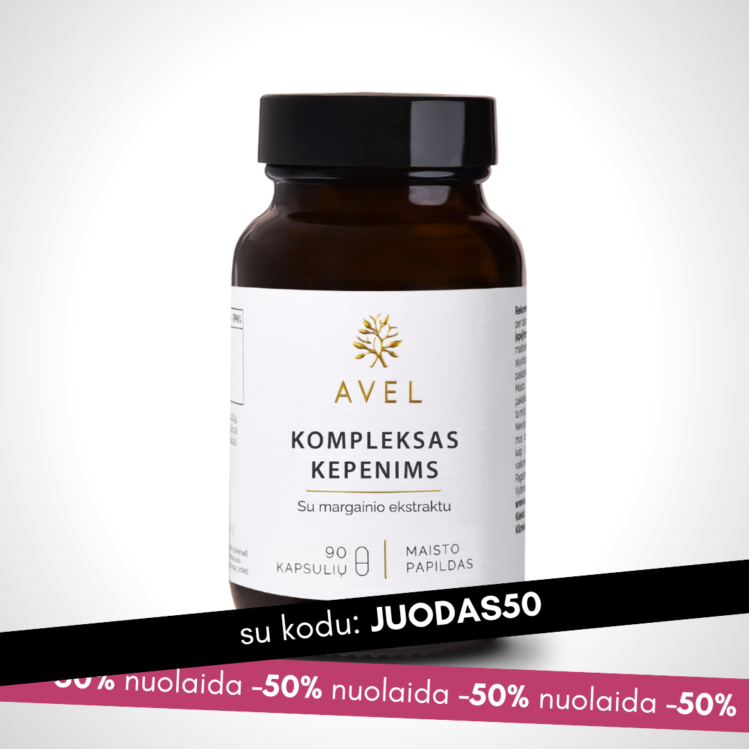 AVEL Kompleksas kepenims – tai subalansuotas augalinių ekstraktų, cholino, NAC ir vitaminų derinys, sukurtas kepenų funkcijai palaikyti ir organizmo detoksikacijai remti. Sudėtyje esantis margainių ekstraktas su silimarinu, cholinas, padedantis palaikyti normalią kepenų veiklą, artišokų ir kiaulpienių ekstraktai, taip pat N-acetil-L-cisteinas prisideda prie natūralaus organizmo valymo proceso. Formulę papildo vitaminai E, B6 ir B12, kurie padeda apsaugoti ląsteles nuo oksidacinės pažaidos ir palaikyti energijos apykaitą.