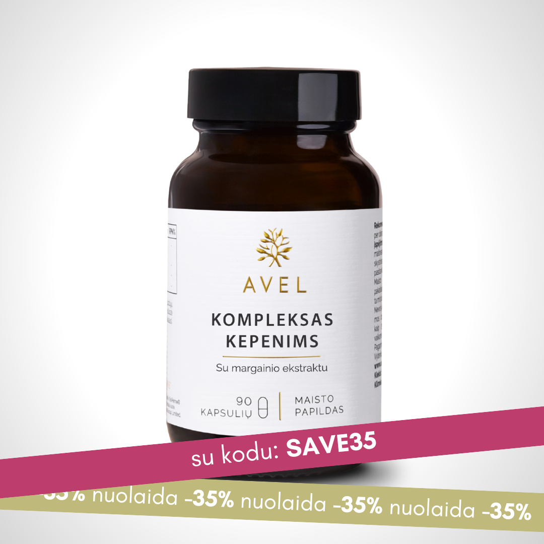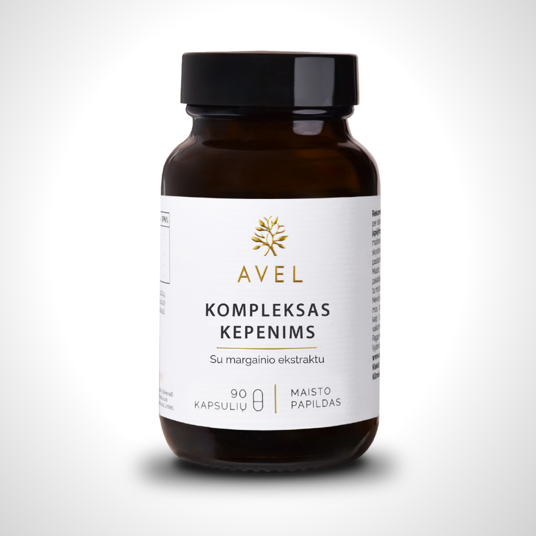AVEL Kompleksas kepenims – tai subalansuotas augalinių ekstraktų, cholino, NAC ir vitaminų derinys. Sudėtyje esantys ingredientai parinkti taip, kad papildytų kasdienę mitybą ir aprūpintų organizmą biologiškai aktyviomis medžiagomis. Formulėje naudojami margainių, artišokų ir kiaulpienių ekstraktai, cholinas, N-acetil-L-cisteinas (NAC) ir vitaminai E, B6 bei B12. Cholinas padeda palaikyti normalią kepenų veiklą ir prisideda prie normalios lipidų apykaitos. Vitaminai E, B6 ir B12 padeda apsaugoti ląsteles nuo oksidacinės pažaidos, palaiko energijos apykaitą ir normalų imuninės sistemos funkcionavimą. Margainis, artišokas ir kiaulpienė yra plačiai naudojami augaliniai ekstraktai, turintys ilgą tradicinio vartojimo istoriją įvairiose kultūrose.