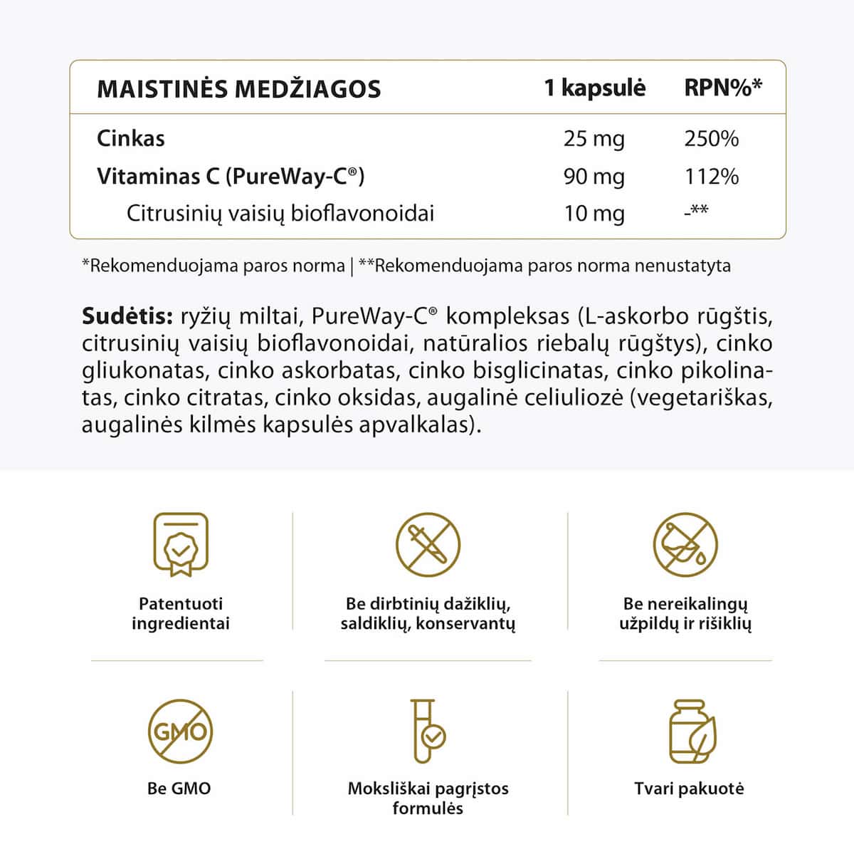 Taip pat kiekvienoje kapsulėje yra 100 mg aukščiausios kokybės vitamino C komplekso, kurį sudaro itin grynas aktyvus ingredientas PureWay-C®. Ši aukščiausios kokybės žaliava siūlo unikalų, sinergetinį ingredientų derinį, kuris leidžia žymiai geriau pasisavinti vitaminą C nei įprasti preparatai: dėl augalinės kilmės riebalų rūgščių ir citrusinių vaisių bioflavonoidų komplekso derinio vitaminas C gali geriau įsisavinti į kraują ir ląsteles, ilgiau išsilaiko. Šis derinys taip pat apsaugo nuo oksidacijos ir yra atsakingas už ilgą produkto galiojimo laiką.