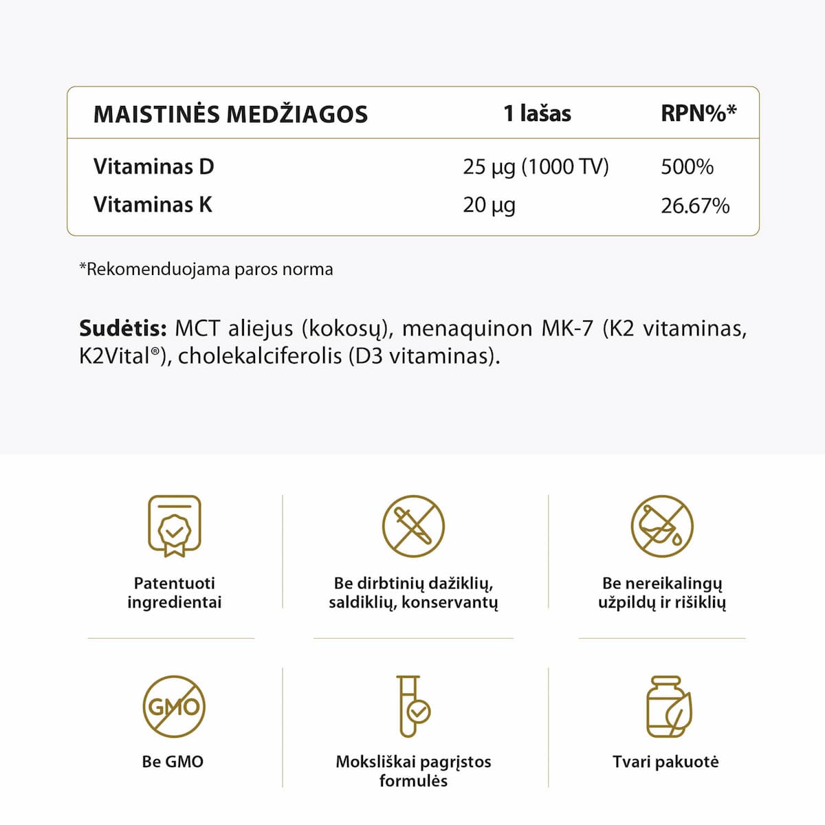 Dauguma vitamino D maisto papildų yra gaminami su daugybe nereikalingų priedų, kurie visiškai neturi jokios vertės jį vartojančiam žmogui. Priešingai, mūsų vitaminas D3+K2 yra pagamintas naudojant tik tris sudedamąsias dalis: