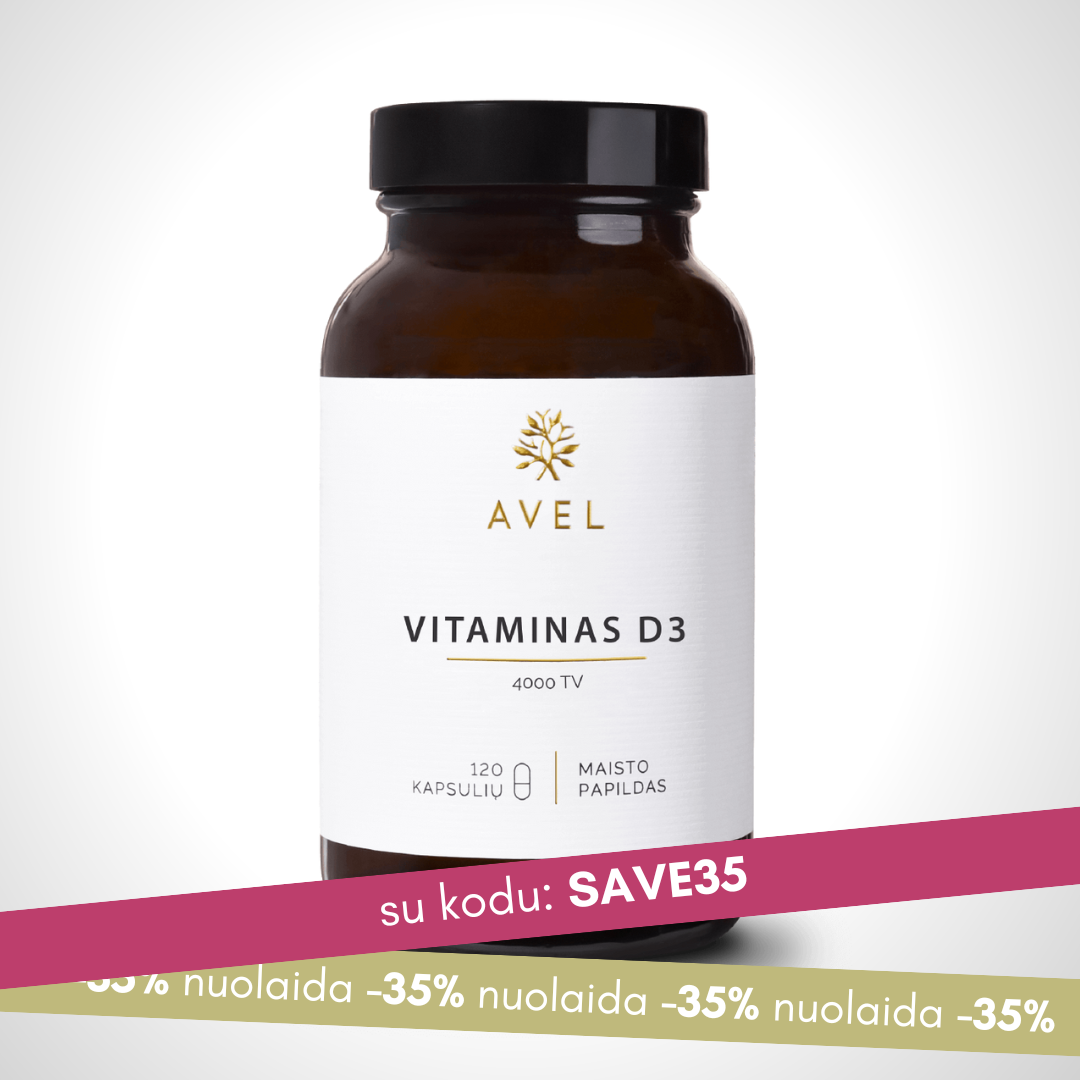 AVEL vitaminas D3 kapsulėse - be nereikalingų priedų ir priemaišų, kurie dažnai randami šio svarbaus vitamino papilduose. Vienoje Kapsulėje net 4000 TV vitamino D3.